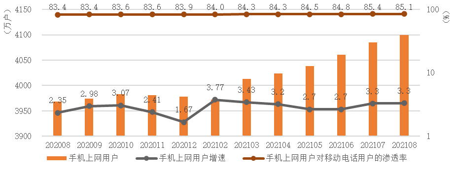 手机上网用户对移动电话用户的渗透率稳步提升。截至8月底,全省手机上网用户4099.9万户,较上年末净增121.4万户,对移动电话用户的渗透率达85.1%,较上年同期提升1.7个百分点。