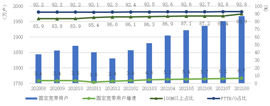 固定宽带用户规模稳步增加,光纤及百兆用户占比持续提升。截至8月底,全省固定宽带用户达1967.5万户,较上年末净增136.5万户。其中光纤接入(FTTH/O)用户1825.4万户,光纤用户渗透率达92.8%,较上年同期提升0.5个百分点;百兆及以上宽带用户1768.8万户,占89.9%,占比较上年同期提升6个百分点。