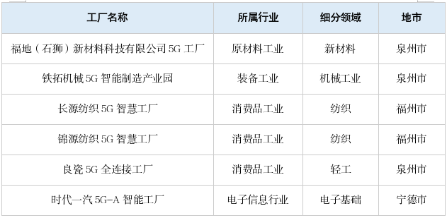 近日,工业和信息化部发布《2025年5G工厂典型应用实践》,全国共遴选出100个技术先进、标杆引领的5G工厂典型应用实践。福建省共有6个项目入围,入围数量居全国第5,分别是:福地(石狮)新材料科技有限公司5G工厂、铁拓机械5G智能制造产业园、长源纺织5G智慧工厂、锦源纺织5G智慧工厂、良瓷5G全连接工厂、时代一汽5G-A智能工厂。