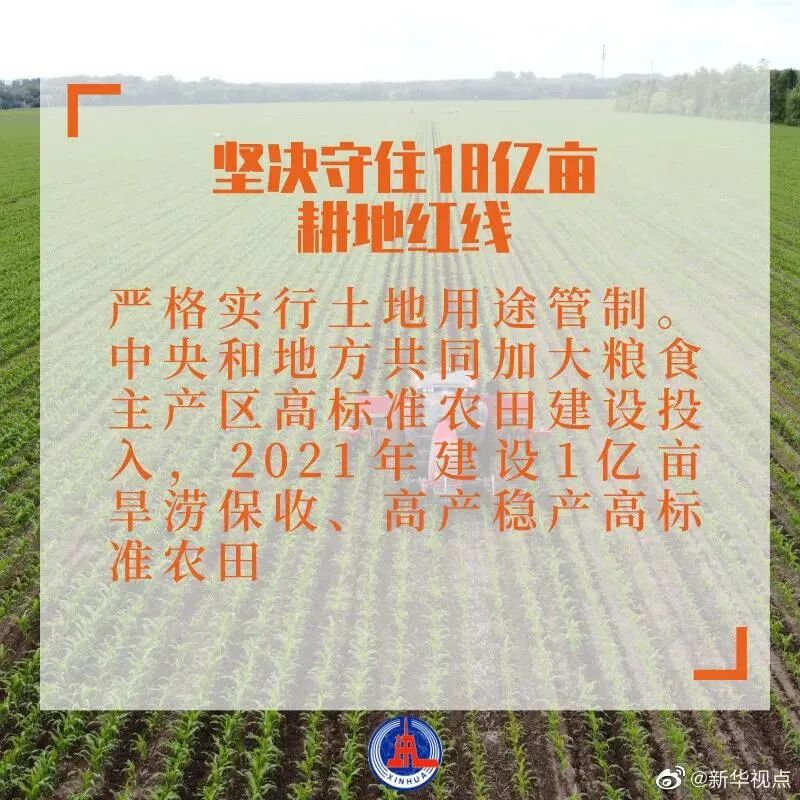 (九)坚决守住18亿亩耕地红线。统筹布局生态、农业、城镇等功能空间,科学划定各类空间管控边界,严格实行土地用途管制。采取“长牙齿”的措施,落实最严格的耕地保护制度。严禁违规占用耕地和违背自然规律绿化造林、挖湖造景,严格控制非农建设占用耕地,深入推进农村乱占耕地建房专项整治行动,坚决遏制耕地“非农化”、防止“非粮化”。明确耕地利用优先序,永久基本农田重点用于粮食特别是口粮生产,一般耕地主要用于粮食和棉、油、糖、蔬菜等农产品及饲草饲料生产。明确耕地和永久基本农田不同的管制目标和管制强度,严格控制耕地转为林地、园地等其他类型农用地,强化土地流转用途监管,确保耕地数量不减少、质量有提高。实施新一轮高标准农田建设规划,提高建设标准和质量,健全管护机制,多渠道筹集建设资金,中央和地方共同加大粮食主产区高标准农田建设投入,2021年建设1亿亩旱涝保收、高产稳产高标准农田。在高标准农田建设中增加的耕地作为占补平衡补充耕地指标在省域内调剂,所得收益用于高标准农田建设。加强和改进建设占用耕地占补平衡管理,严格新增耕地核实认定和监管。健全耕地数量和质量监测监管机制,加强耕地保护督察和执法监督,开展“十三五”时期省级政府耕地保护责任目标考核。