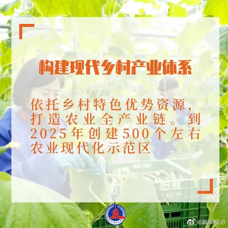 文件确定,把乡村建设摆在社会主义现代化建设的重要位置,全面推进乡村产业、人才、文化、生态、组织振兴,充分发挥农业产品供给、生态屏障、文化传承等功能,走中国特色社会主义乡村振兴道路,加快农业农村现代化,加快形成工农互促、城乡互补、协调发展、共同繁荣的新型工农城乡关系,促进农业高质高效、乡村宜居宜业、农民富裕富足。