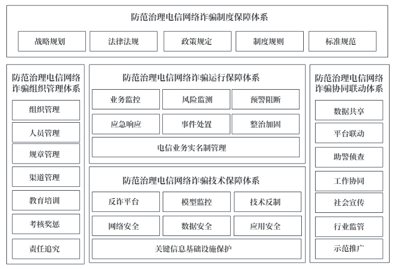 制度保障体系主要从明确电信反诈战略规划、遵守电信反诈法律法规、制定电信反诈政策规定和指引、发布电信反诈管理制度和实施办法、健全电信反诈标准规范等方面着手,以此指导电信反诈组织管理、技术防护、运行保障以及协同联动等相关工作的开展。具体开展的内容包括规划电信反诈总体方针和顶层设计,制定反电信网络诈骗的具体战略部署及目标任务;在遵循总体国家安全观及电信反诈相关法律法规的基础上,完善电信反诈合规管理制度体系;根据电信反诈工作开展的实际需求,制定电信反诈政策文件及执行指引;配套建设反电信网络诈骗的相关管理制度和实施办法;健全电信反诈相关标准规范和操作指南等。