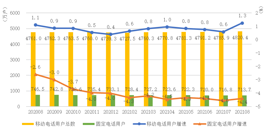 移动电话用户规模平稳增长,5G用户快速发展。截至8月底,全省电话用户达5534.1万户,较上年末净增61.8万户,其中固定电话用户713.7万户,较上年末净减19.3万户;移动电话用户4820.4万户,较上年末净增81.1万户。4G用户达3255.2万户,占移动电话用户的67.5%;5G手机终端连接数达1113.3万户,较上年末净增574.3万户。