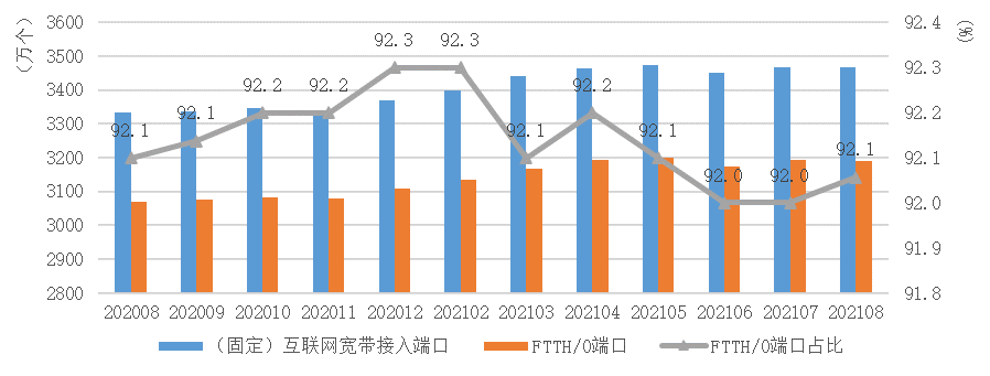 全光网络建设持续推进,光纤接入端口占比超九成。截至8月底,全省固定宽带接入端口数量达3466.7万个,较上年末净增96.7万个。其中,光纤接入(FTTH/O)端口3191.4万个,较上年末净增81万个,在占比达92.1%。