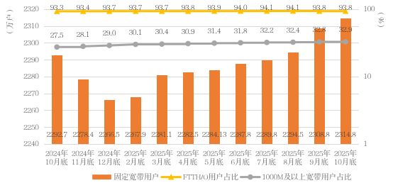 千兆宽带用户保持快速增长。截至10月底,全省(固定)互联网宽带接入用户达2314.8万户,同比增长1%。其中,FTTH/0用户2171.1万户,同比增长1.5%,占总用户数的93.8%;接入速率在1000M及以上的宽带用户760.5万户,同比增长20.5%,在(固定)互联网宽带接入用户中占比32.9%。