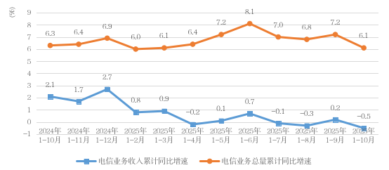 电信业务收入负增长、业务总量增长放缓。1-10月,全省电信业务收入455.1亿元,同比下降0.5%,增速较1-9月下降0.7个百分点;按上年不变价计算的电信业务总量434.9亿元,同比增长6.1%,增速较1-9月下降1个百分点。